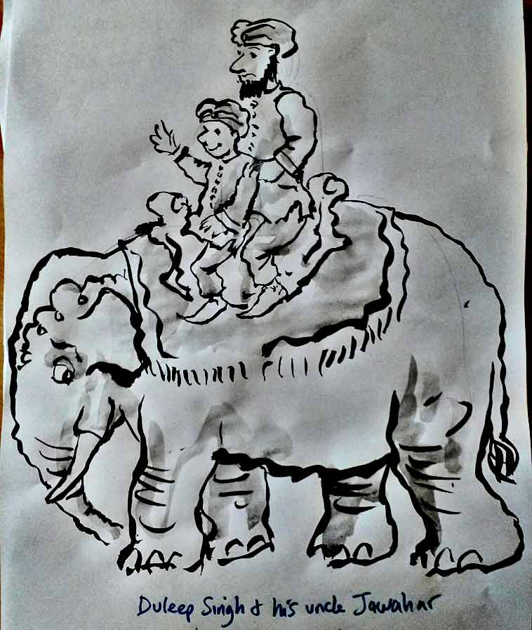 The other day I found myself explaining this piece of history to some very young children. Its a complex tale, and not much fun. But I found one moment with which to engage them, where the little Maharaja was presented to the Sikh army by his uncle, on an elephant. So I drew this for them, letting them guess which animal it would turn out to be as the drawing grew.