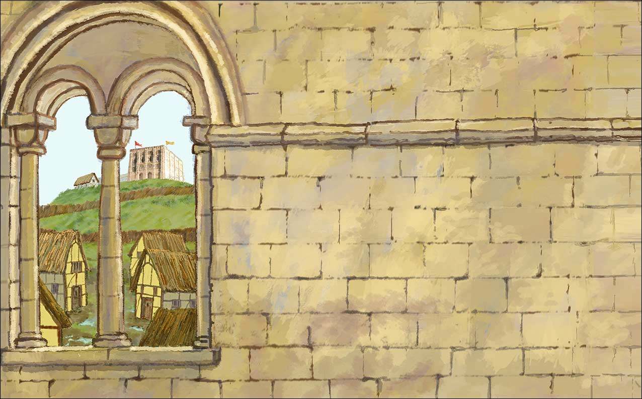 So I had the idea of a window, which would (a) say “Norman” by its unmistakable Romanesque architecture and (b) show the Castle in practically the same view as it really is from the Forum – no chance of anybody not knowing what that was supposed to be!