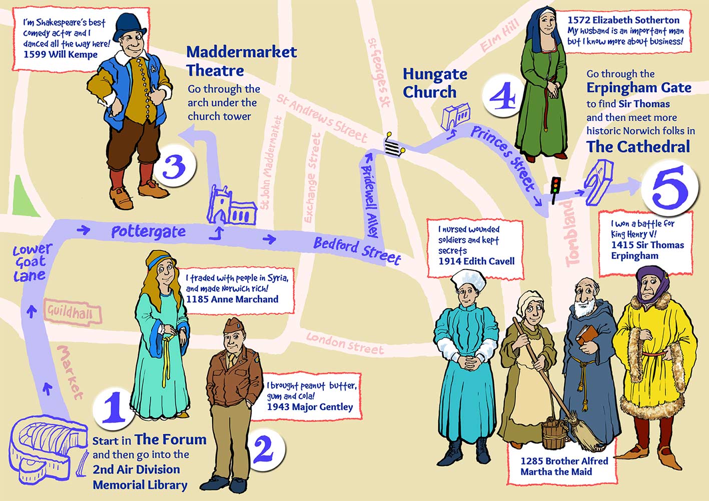 I have designed, illustrated and written the leaflet, which will guide them from The Forum to the Cathedral, on a short walk taking in five places where they can meet costumed characters with a strong connection to those locations.